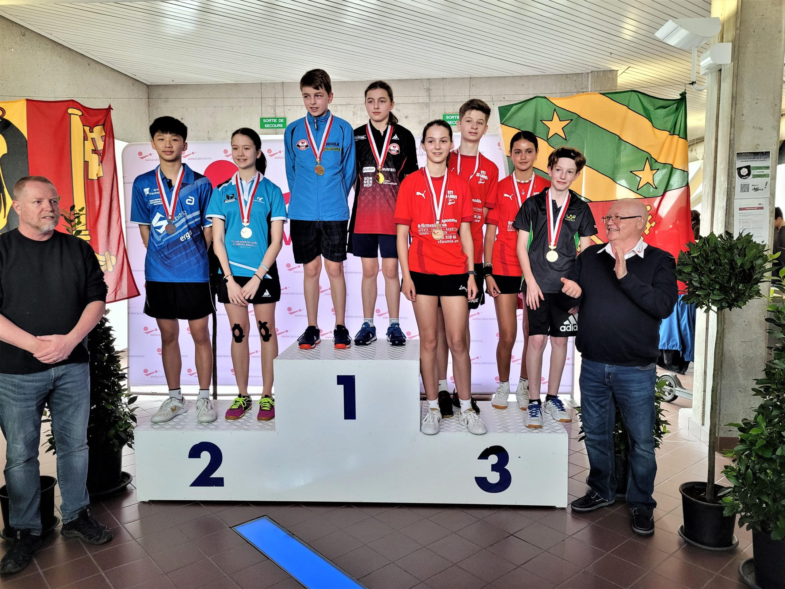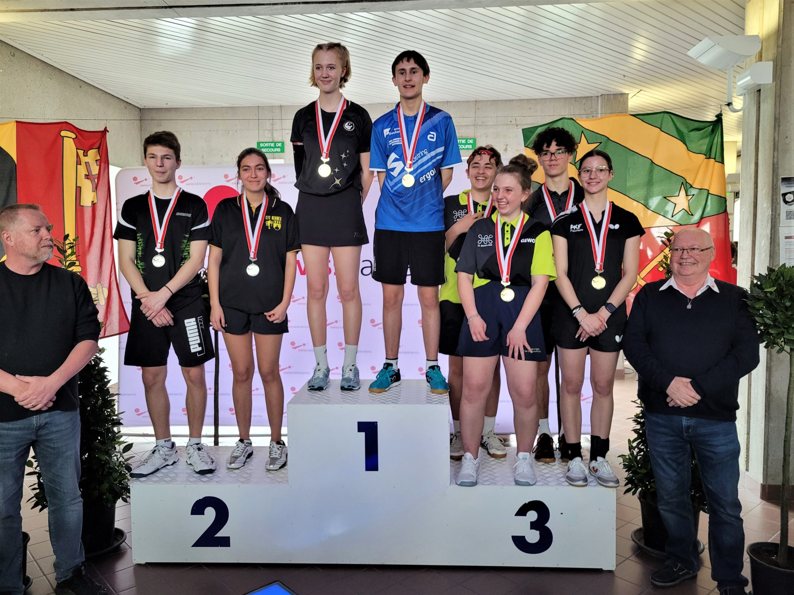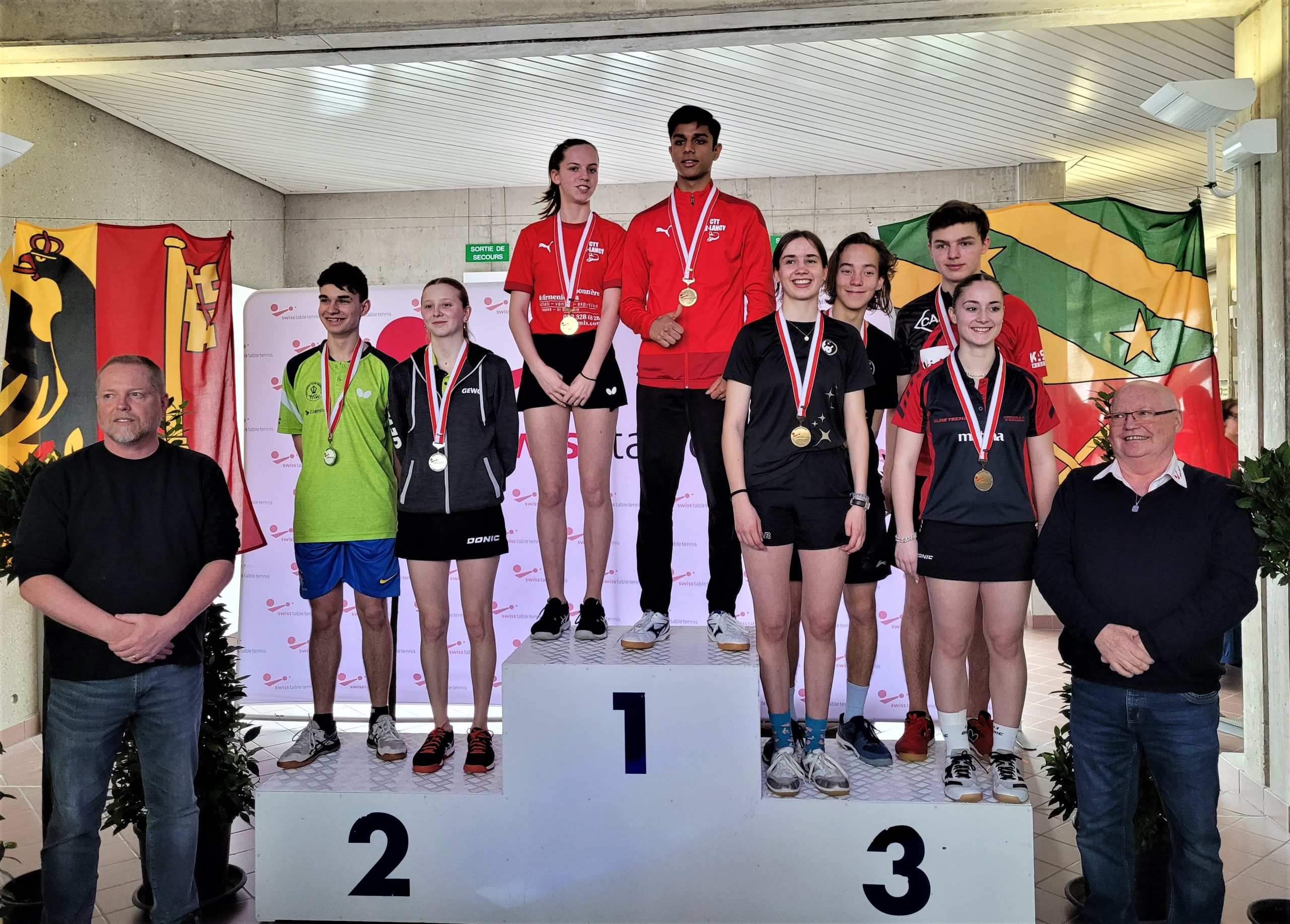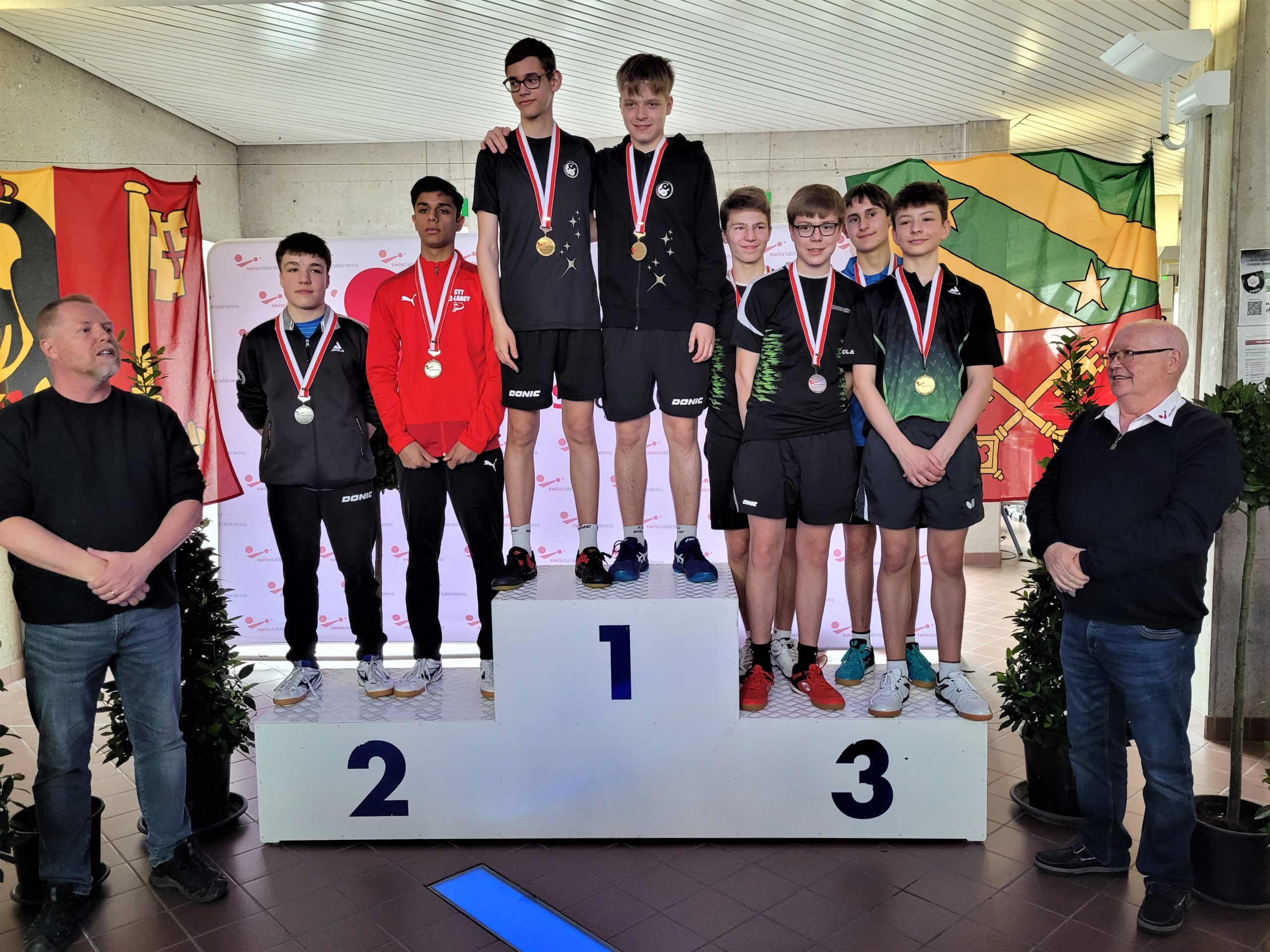 Trois des quatre médailles d'or proviennent des catégories de double : en Doubles garçons U15 avec Samuel Durrlemann (UGS-Chênois) qui l'emporte avec Michel Kloss (Rapid Lucerne), en Doubles mixte U19 avec le duo du ZZ-Lancy Fanny Doutaz/Abishek Vepa et finalement Ester Hubnerova (ZZ-Lancy) qui prend l'or en Doubles filles avec Nina Tulii (La Chaux-de-Fonds). L'unique titre en simple du week-end a été amené par Fanny Doutaz en Simple filles U17.