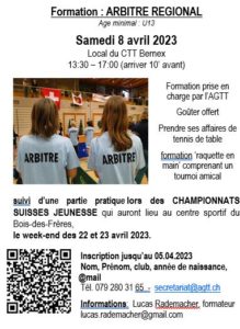 Une formation pratique le samedi 8 avril 2023 l'après-midi suivi d'une participation à l'équipe d'arbitrage le week-end du 22-23 avril (samedi ou dimanche, matin, après-midi ou journée selon ses disponibilités).
