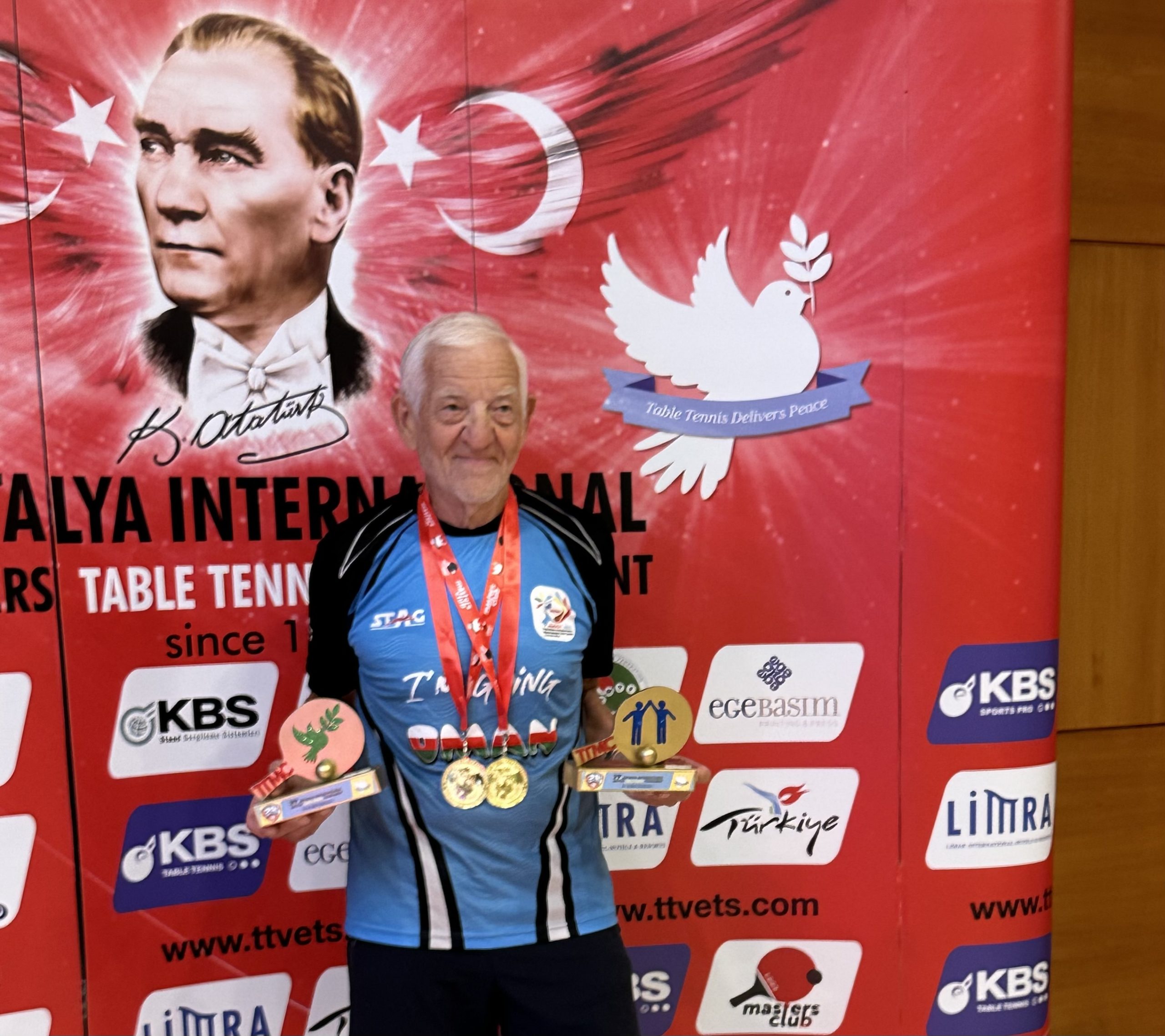En résumé, le tournoi a été très relevé dans toutes les catégories de jeu et on retrouve souvent des noms de joueurs abonnés aux bons résultats dans les championnats du monde et d’Europe chez les vétérans. Le bilan est très satisfaisant pour les 3 joueurs genevois et plus particulièrement pour le magnifique doublé simples et doubles pour Jacky qui complète une impressionnante collection de médailles au niveau international. On relèvera aussi que Topliça a rencontré des joueurs de haut niveau dans sa catégorie d’âge et qu’Alain a fait un très bon match contre le joueur anglais Lewis qui est considéré comme un des meilleurs joueurs de sa catégorie d’âge.